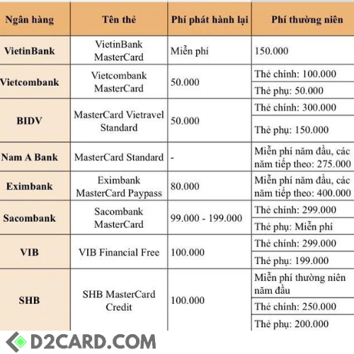 Với thẻ tín dụng MasterCard hạng chuẩn, hầu hết các ngân hàng hiện nay đều đang miễn phí phát hành lần đầu nhằm thu hút khách hàng. Tuy nhiên, với việc phát hành lại, mức phí mà các ngân hàng thu dao động trong khoảng từ 50.000 - 200.000 đồng. Riêng VietinBank đang miễn phí phát hành lại thẻ.